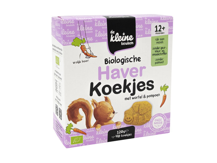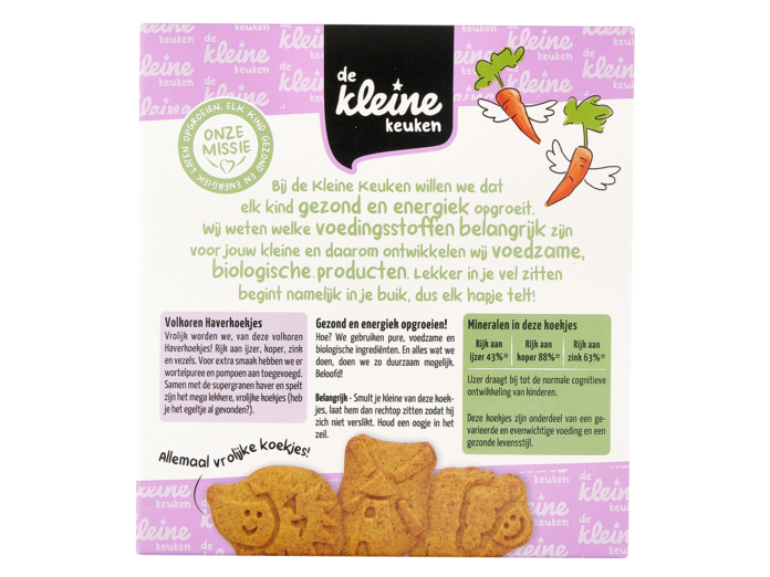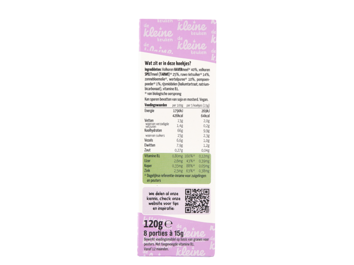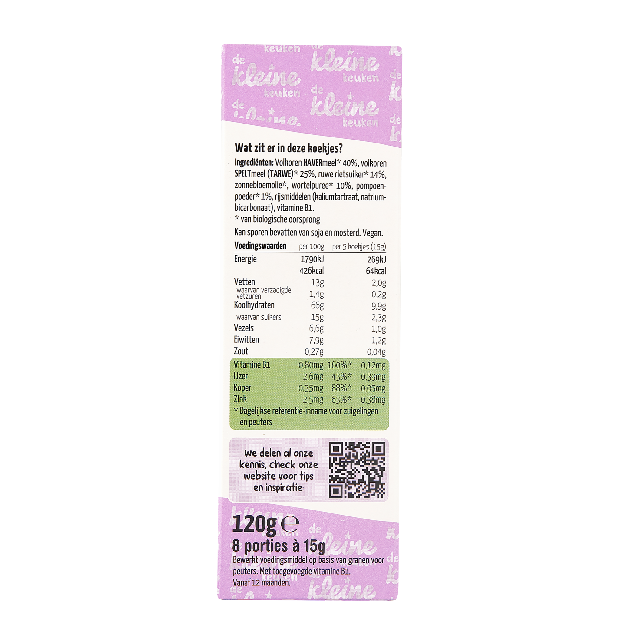 Vollkorn-HAFERmehl* 40 %, Vollkorn-DINKELmehl* 25 %, Rohrohrzucker*, Sonnenblumenöl*, Karottenpüree* 10 %, Kürbispulver* 1 %, Backtriebmittel (Kaliumtartrat, Natriumhydrogencarbonat), Vitamin B1.