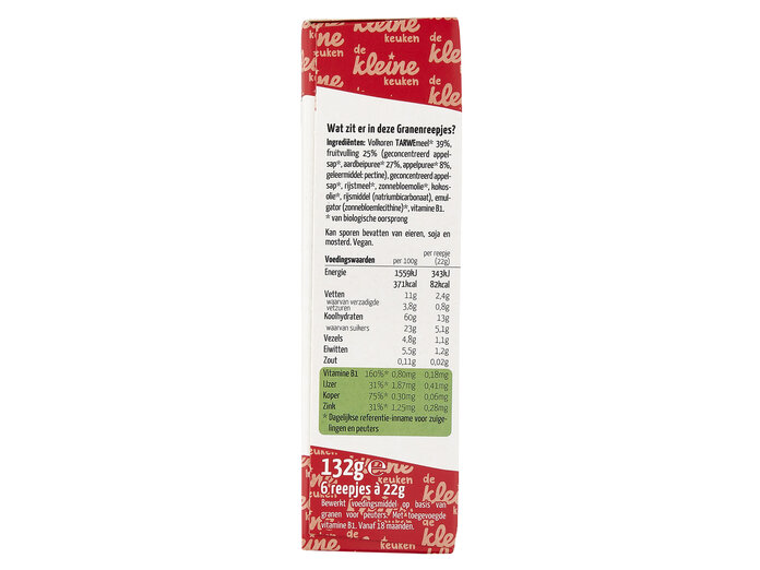 Whole grain WHEAT flour* 38%, fruit filling 25% (concentrated apple juice*, strawberry puree * 27%, apple puree* 8%, gelling agent: pectin), concentrated apple juice*, rice flour*, sunflower oil*, coconut oil*, emulsifier (sunflower lecithin)*, raising agent (sodium bicarbonate)*, lemon juice*, vitamin B1.