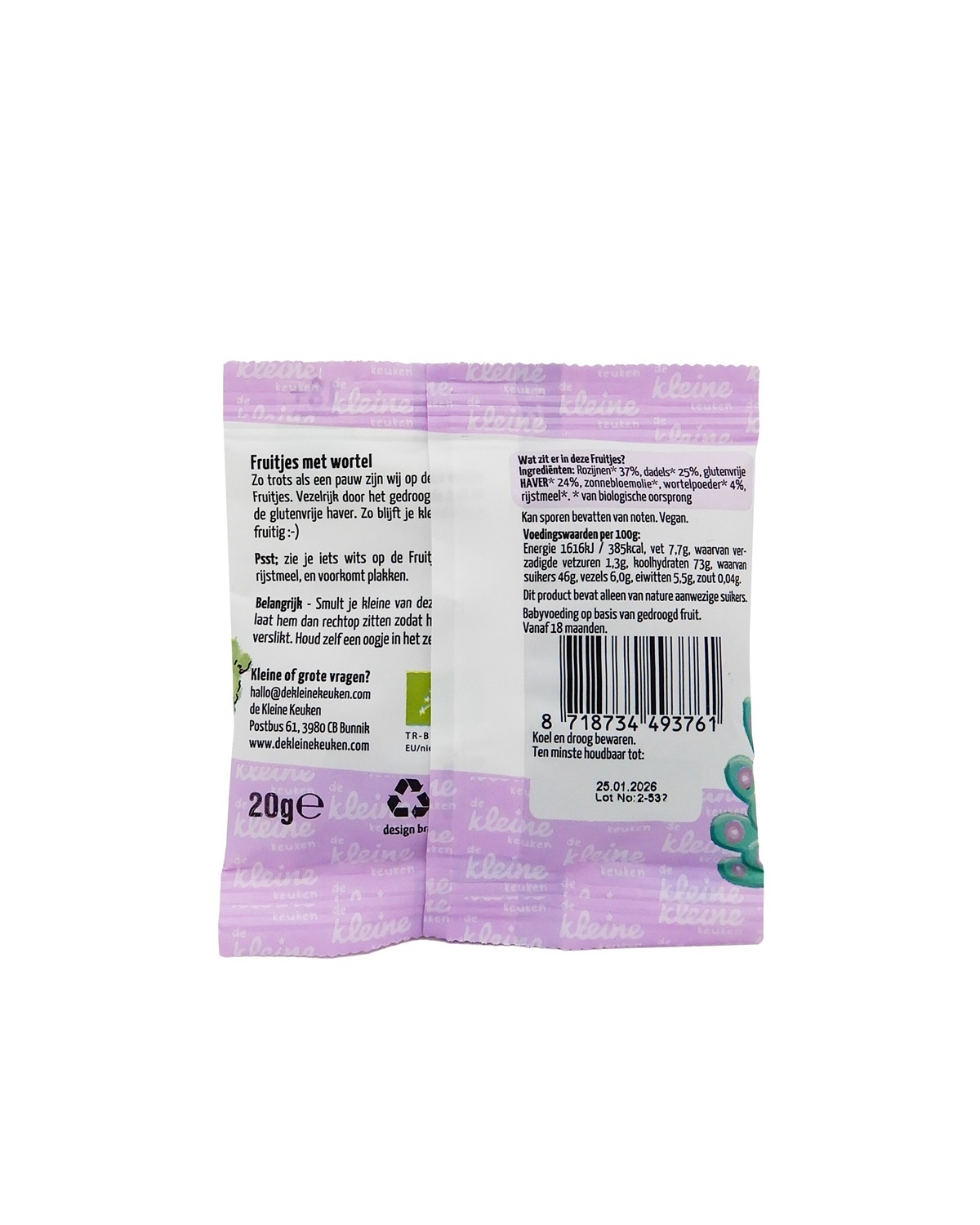 Raisins* 37%, dates* 25%, gluten-free OATS* 24%, sunflower oil*, carrot powder* 4%, rice flour*.