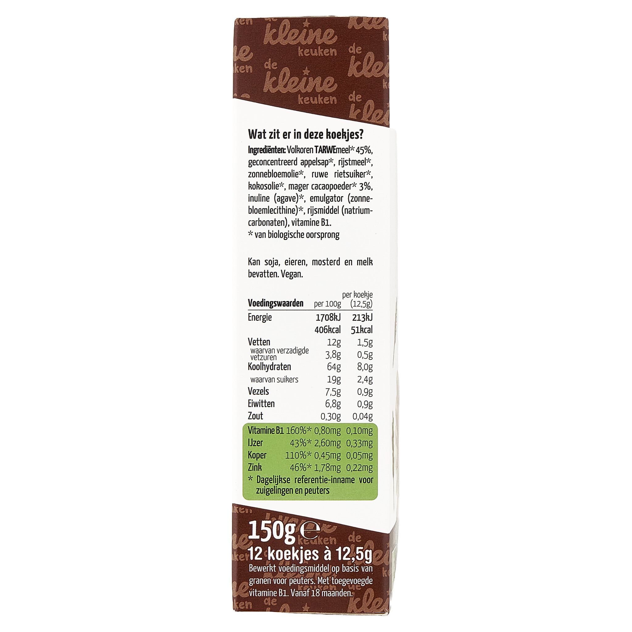 Volkoren TARWEmeel* 45%, geconcentreerd appelsap*, rijstmeel*, zonnebloemolie*, ruwe rietsuiker, kokosolie*, mager cacaopoeder* 3%, inuline (agave)*, emulgator (zonnebloemlecithine)*, rijsmiddel (natriumcarbonaten), vitamine B1.