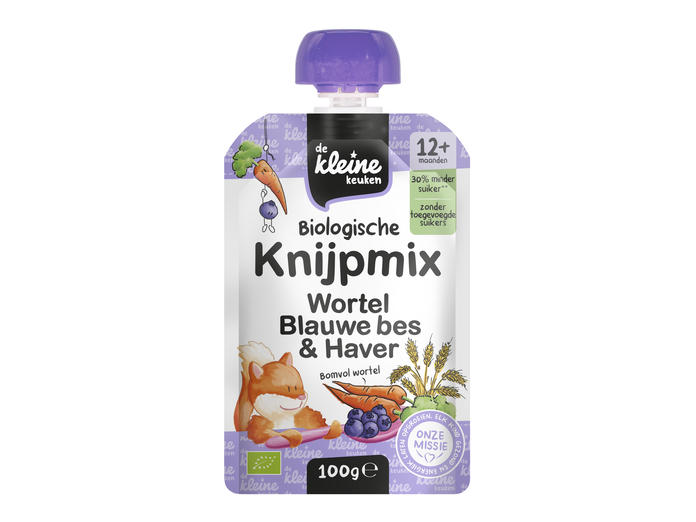 Yes! Knijpmix met 30% minder suiker dan ander knijpfruit. Gemaakt van 100% groente, fruit en haver. That’s it. Speciaal voor kleintjes vanaf 12 maanden nog wat voedzamer, omdat het bomvol groente zit (65%) en extra haver bevat. Met de lekkere smaak van wortel en blauwe bes. Ons beste alternatief voor als je geen vers fruit bij de hand hebt. Natuurlijk zitten er geen toegevoegde suikers en andere toevoegingen in, vinden wij heel normaal.